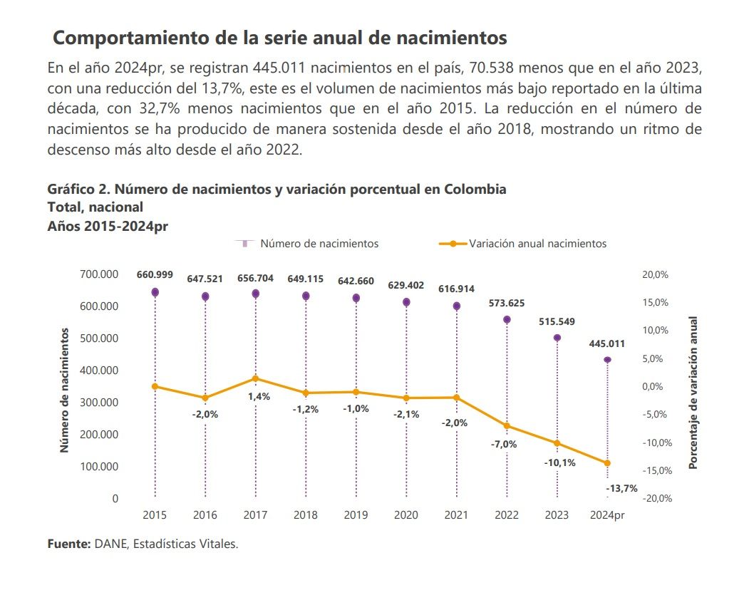Durante 2024 nacieron en Colombia 453.901 personas, una cifra que es 35 por ciento inferior a la de 2008, cuando los nacimientos fueron 715.453, y también una caída del 12 por ciento con respecto a 2023 (515.549). Esa resulta ser la mayor caída anual en este indicador en la historia, confirmando la tendencia que inició en 2022, cuando la disminución anual fue del 7 por ciento, que siguió en 2023, cuando fue del 10,1 por ciento.