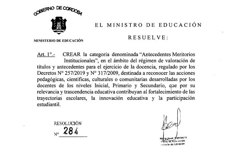 El Ministerio de Educación de Córdoba promulgó este viernes la Resolución 284, que otorga puntaje oficial a las actividades que realizan las y los docentes de los niveles Inicial, Primario y Secundario fuera de los edificios escolares.
