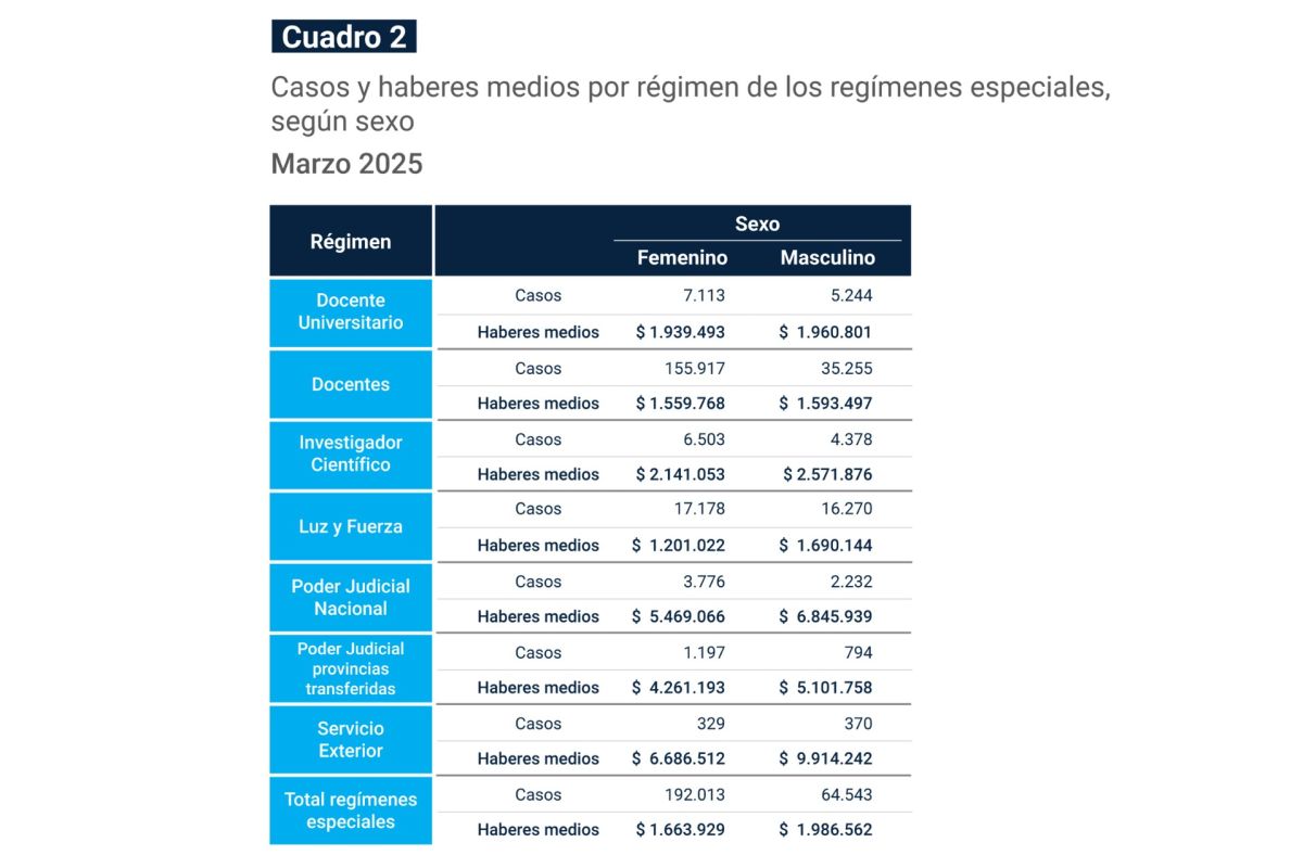 Según el informe de EstadÃsticas de la Seguridad social del ANSES, del primer trimestre , a marzo 2025, del total de beneficios contributivos 7.221.347 correspondÃan al Régimen General, mientras que 256.561 son prestaciones correspondientes a regÃmenes especiales. Es decir, que estos últimos representan solamente un 3,4% del total de los beneficios contributivos. De este pequeño universo el 75% pertenecen al régimen docente, en total son 191.176 docentes y si desagregamos por sexo 155.917 son mujeres y 35.255 son hombres. (Cuadro 2)