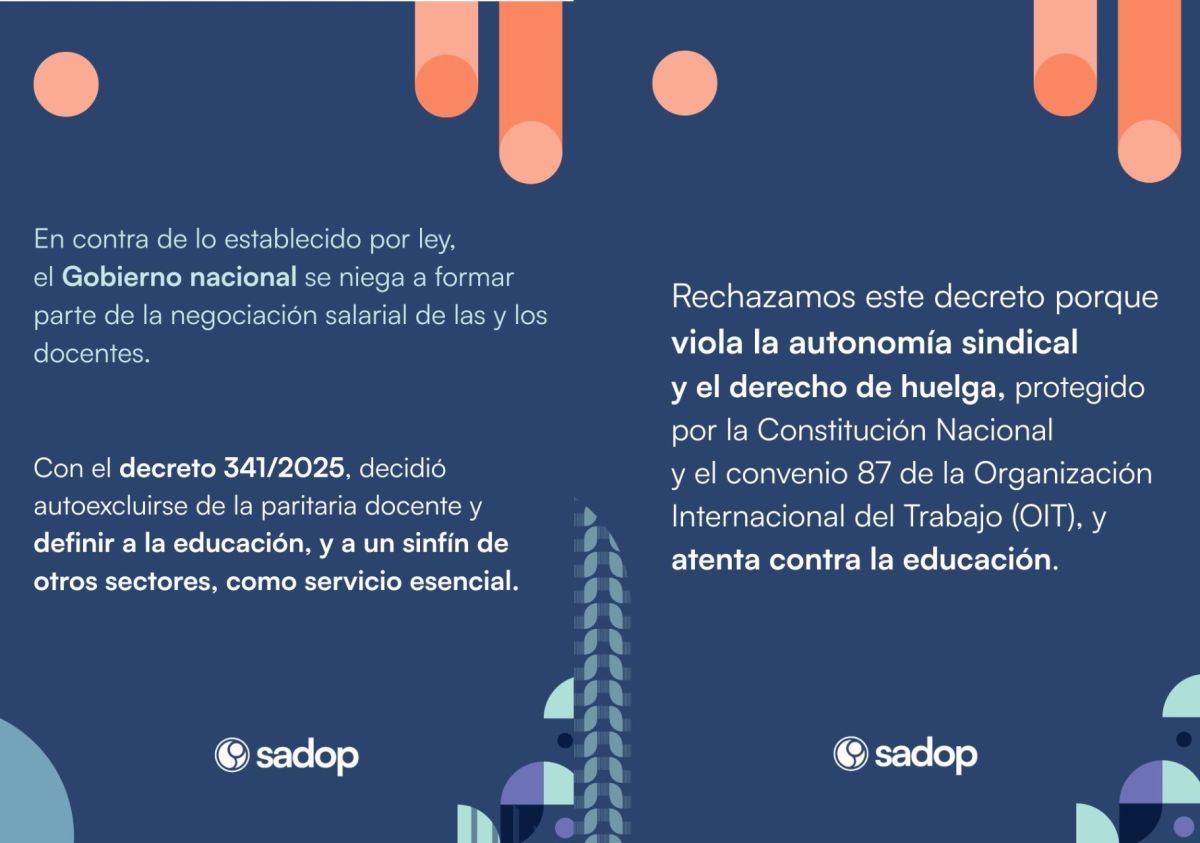 El Sindicato Argentino de Docentes Privados (SADOP), junto a otros gremios de la CGT, también se pronunció contra la medida.