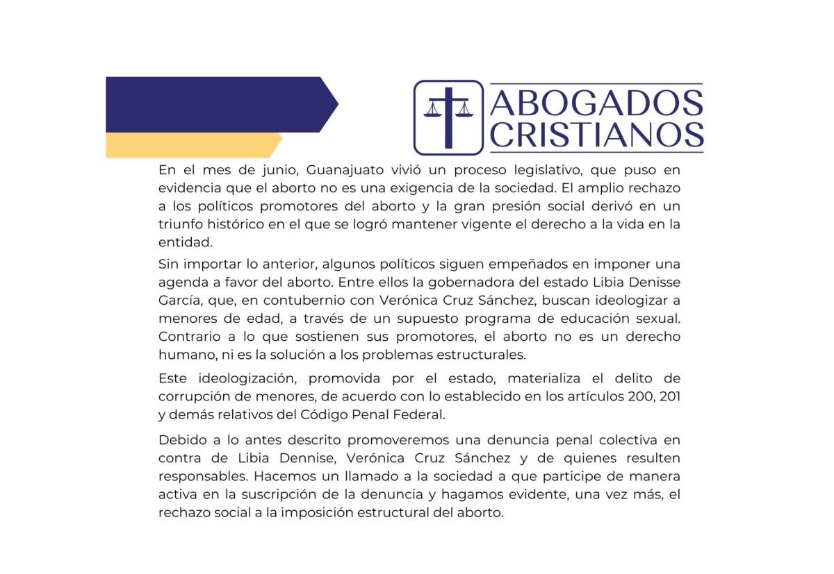 Al conocerse el anuncio de la implementación de un programa de Educación Sexual, la asociación civil Abogados Cristianos puso el grito en el cielo y anticipó una denuncia penal colectiva en contra de la gobernadora GarcÃa Muñoz Ledo y Verónica Cruz Sánchez, directora de la organización Las Libres, creadora del programa que ya lleva 25 años aplicándose para evitar agresiones sexuales, violencia en las relaciones, prevenir embarazos adolescentes y evitar la deserción escolar.