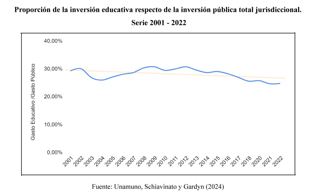 Para comprender la situación actual no basta sólo con considerar el corrimiento del Estado nacional en sus responsabilidades financieras. En las jurisdicciones se evidencia una tendencia a la baja en la inversión educativa en las últimas dos décadas:
