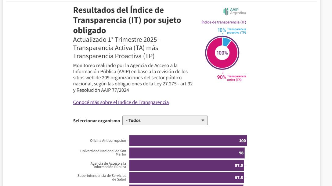 La Agencia de Acceso a la Información Pública (AAIP) dio a conocer los resultados del del Índice de Transparencia (IT) por sujeto obligado basado en la revisión de los sitios web de 209 instituciones públicas de diversas áreas, durante el primer trimestre de 2025.